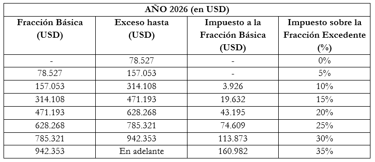 La nueva tabla fija el umbral exento en USD 12.208 anuales, equivalente a USD 1.017,33 mensuales, por encima del cual las personas naturales deberán declarar y pagar el impuesto. Este valor representa un ajuste frente al ejercicio fiscal anterior y responde a la actualización de variables macroeconómicas, como la inflación.